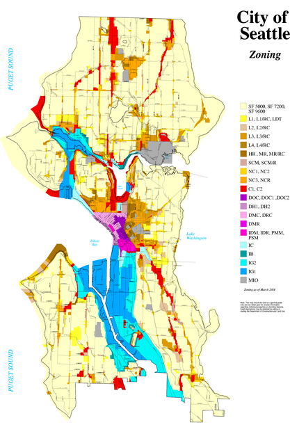 Land use zones in the city of Seattle. Blue = commercial/industrial, purple and red = commercial,