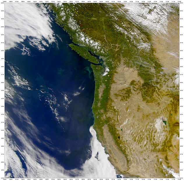 ![]() This satellite image of the Pacific Northwest was acquired on October 3, 2001, by the Sea-viewing Wide Field-of-view Sensor (SeaWiFS). What patterns do you discern on the land and in the ocean? What processes do you think generated the patterns that you detect? Click on the image to view our home at a much higher resolution (warning: large file size [2.9 Megabytes]!)...