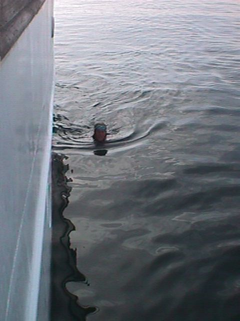 The film of the surface next to our boat, heaved to and drifting, is so smooth it