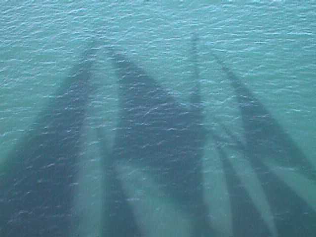 A brilliant ship's shadow on a bright day off Vineyard Haven.