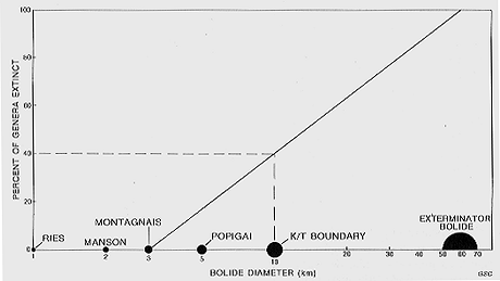 At what diameter or energy does an impact affect climate, the oceans, and/or life on Earth?