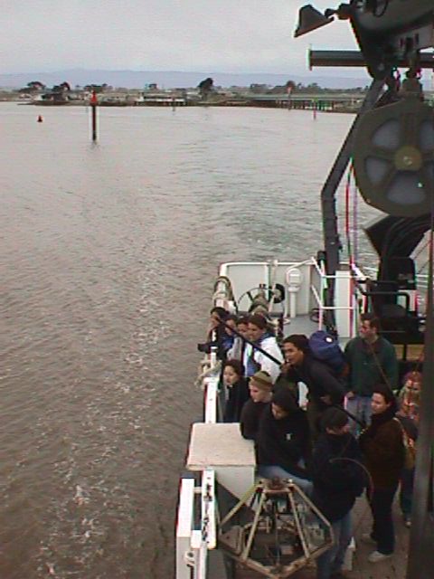 After embarking at the dock (see map) near the Moss Landing Marine Laboratories, we left port with plans to sample geological, biological, and physical parameters at each of 3 stations: near the sandy shore, on the brink of the submarine canyon, and near the kelp forests.